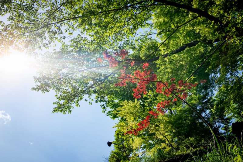 この時期のもみじは新緑を代表するような綺麗な黄緑色。しかしどういうわけかこの1本だけは季節を間違えたように真っ赤に紅葉。もみじにも季節によって発色の異なる品種があるのでしょうかね? 青い空に新緑の緑、そこに1本のもみじとはなかなか憎い演出じゃないですか。