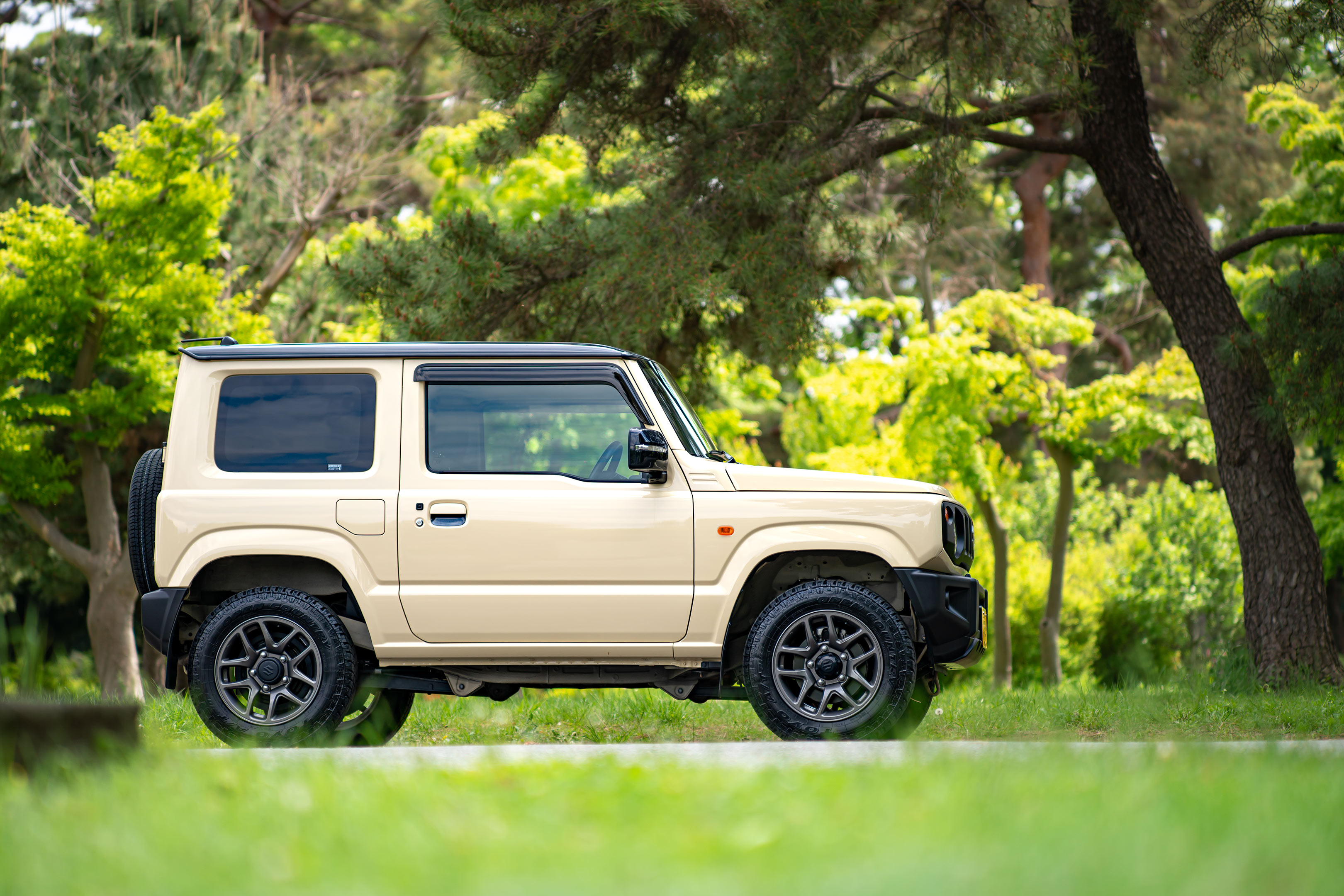 オフロードや雪道も走れるATタイヤですから、側面までご覧の通りゴツゴツなデザインです。それでもMTやRTと比べるとエッジが丸いですから随分優しく見えますね。サイズもノーマルと同じですから太くもなく大きくもなく、四駆乗ってまっせ!っていう主張は控えめです。