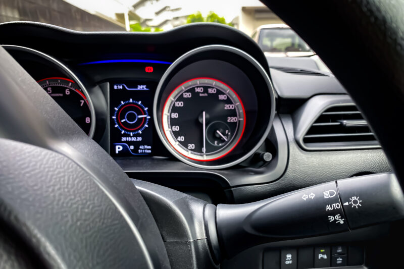昼間はともかく夜間走行時は自動的にライトが点灯します。いえ、それくらいの機能は私のジムニーにも搭載されていますが一番の違いはOFFが無い事。周囲が暗い場合にエンジン始動をすれば同時にライト点灯、ただし対向車に対しての配慮や路駐するような時に常時点灯というのは周囲に迷惑となる場合もあるため、ヘッドライトのみ消灯しスモールライトだけ点灯というポジションは設定されていますが、それとて車が発進すれば解除され再びヘッドライトが点灯。消灯のまま走るという術は無いのです。
