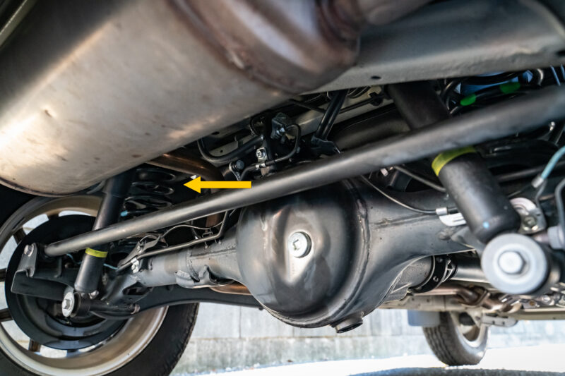 上の写真の黄色い矢印の先にあるのがリアサスペンションのコイルスプリング。下の写真の赤い矢印の先のスプリング中心付近に見える逆三角形のゴムの塊がリアスプリングアッパーシート。このアッパーシートですが新型ジムニーの初期型は三角の先端に穴が開いておらずシート上部に水や泥が溜まり周囲に錆を発生させてしまうと言われており、初期オーナーでその点気にする人はシート先端にドライバーのようなもので穴を開け水が排出するよう工夫したりしているようですが、現在納車されている最新車両においてはここが穴あきの対策品に改良されています。