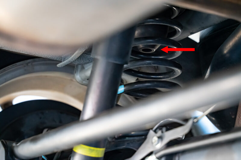 作業としてはリアスプリングを一旦取り外す必要がありますから結構手間なんですよね。特に右側はマフラーも外さないと作業は難しいわけで。これらのパーツ流用と作業に関して、今回は保証の範囲内という事で無償対応していただきました。