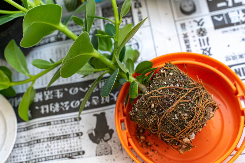 この植物は茎がすごく柔らかく無理な力を加えると簡単に折れてしまいそうなので、プラスチックの植木鉢を両手で少し潰しながらグニュグニュと変形させ密着した土を剥がしつつ引き抜きました。