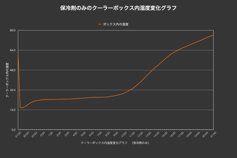 保冷剤のみをボックスに入れ検証していた時のボックス内の湿度をグラフにしたものが下の図。
