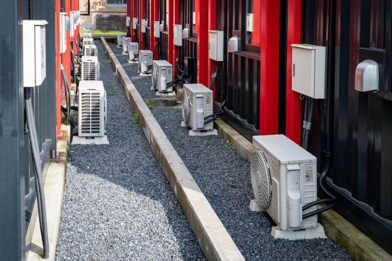 コンテナですからトレーラーで引っ張れば簡単に移動は出来るのでしょうけれど、ホテルなので当然全ての部屋にはユニットバスも付いていますしエアコンも完備されています。従いましてコンテナはしっかり地面に固定されておりボックスの裏側はこの通りエアコンの室外機が並んでおります。