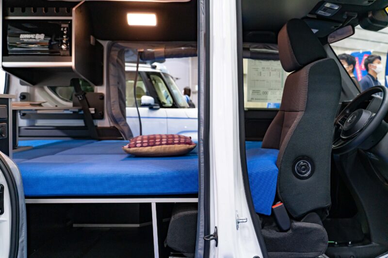 だから車内で存在感のある運転席をどう上手くベッドスペースにトランスフォームさせるかが各社のアイデアが現れる部分でして。こちらの会社の答えは回転シート!というわけですね。