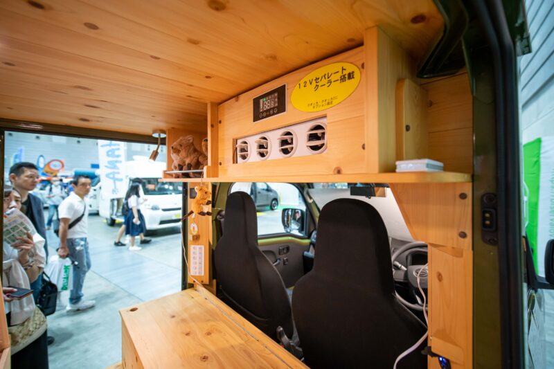 ただこちらは徹底的にヒノキに拘っていますからご覧の通り専用スペースにとても美しく配置されていました。ここから冷気が出て来れば車中泊でも車内は理想的に冷えそうですね。こちらもリチウムバッテリーを電源として使っていましたが、通常使用であれば容量的に一晩もつそうです。これはいいですね。