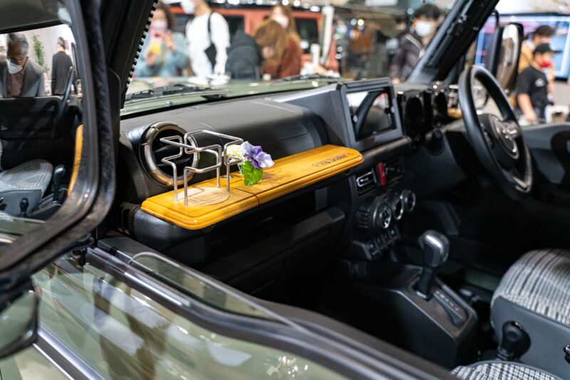 ジムニーの助手席にはアクセサリー用のネジ穴が2箇所準備されていてオーナー自身が使いやすいようにカスタマイズする前提で設計されています。