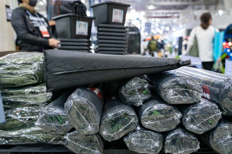 ただしそうした毛布等が無い場合には一苦労。そこでこちらのブースで展示されていたこの専用クッションはシートの凹みを自然な感じに埋めてくれて快適なフラット環境が実現するというアイテム。しかもインフレータータイプなので使わない時は空気を抜いて丸めておけばかなりコンパクト。なるほど便利そうですね。