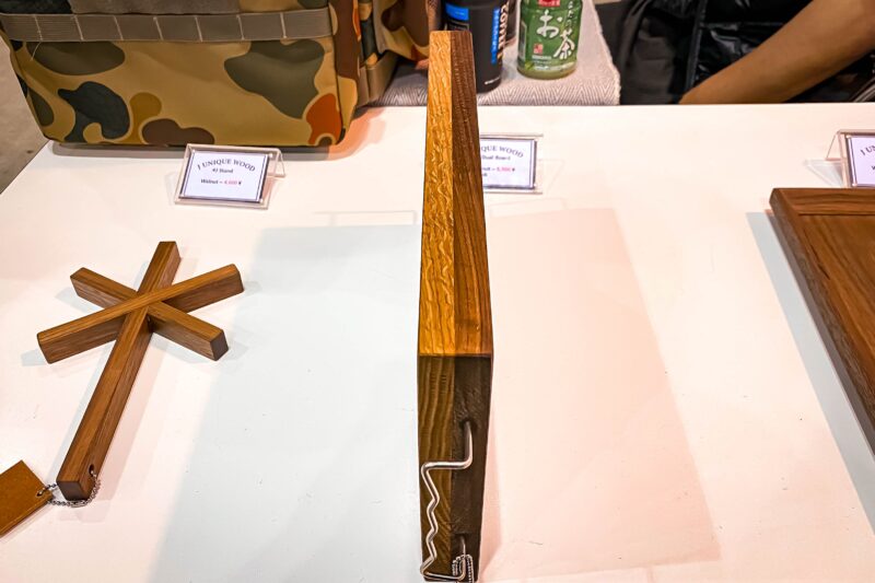 オイル仕上げと思われる表面処理が素材の重厚感を上手く引き出していてとても高級感があります。アウトドアショーなので最初はキャンプ用グッズかと思って近づいたブースでしたが、家庭用インテリア製品としての狙いもあるみたいですね。こちらはちょっと値がはります。