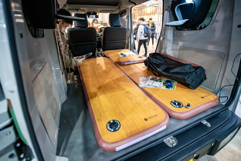 汎用サイズと車種別専用サイズが準備されているそうでジムニー用も設定されているそうです。欠点があるとすれば一般的な車中泊マットと比べ折り畳んだ時のサイズが大きい事。そこだけ許容できる人なら最高のマットかもしれませんね。展示会の時点ではまだ販売されておらず、23年1月下旬くらいにリリース予定。