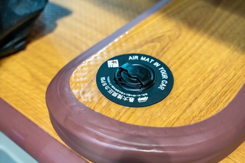 吸気口は完全にSUPと同じですね。ワンウェイバルブが入っているため空気を入れている途中でバルブを外してもボード内の空気が逃げることはありません。8PSIと書かれていますから一般的なSUPの12PSIと比べたらそこまでの空気圧ではありませんが、少なくともこの上に人が寝たくらいでは凹むような圧ではありませんね。