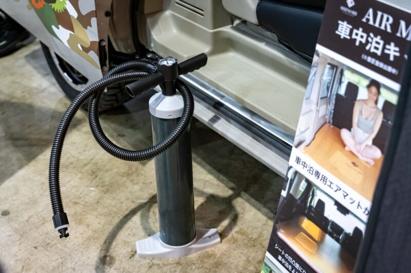 こちらのブース名は忘れてしまいましたが、ちょっと面白い車中泊用エアマットの展示を行っておりました。一見すると単なる木目調のエアマットですが、実はこのマットはSUPでお馴染みのインフレータブルマット素材をそのまま車中泊用に応用しているので、中身は空気でありながらめちゃくちゃ剛性の高いまっとになっています。