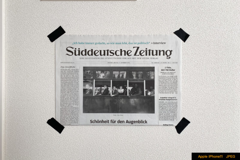 この写真は壁に新聞紙を貼り付けてiPhoneで撮影したJPEG画像です。黒い文字の周囲に1枚目のヘリコプター同様の白い縁が出ているのが分かります。部分切り出しをした拡大画像で見ると一目瞭然ですね。