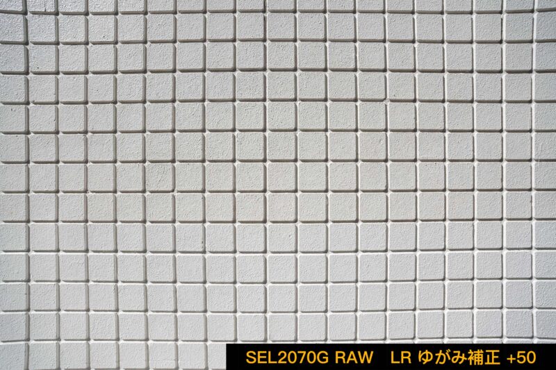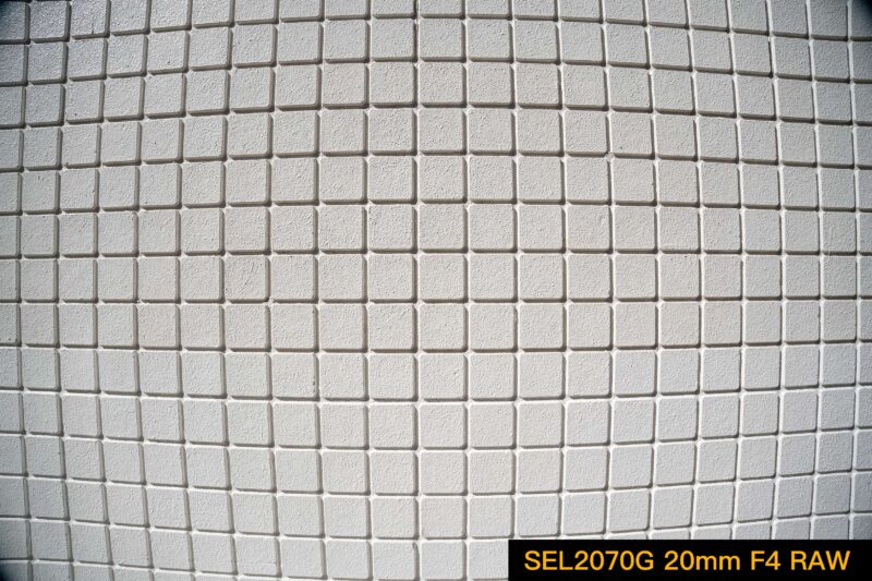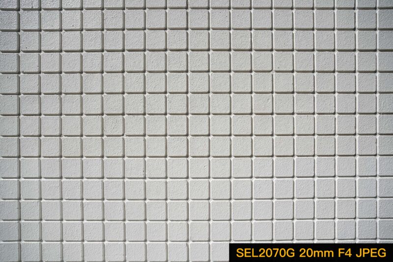 こちらの画像は規則正しく並んだタイルの壁をSEL2070Gのワイド端20mmで撮影したものです。記録フォーマットはJPEG。撮影時、ファインダーや背面液晶にリアルタイム表示されるライブ画像もこれと同様のものでプレビュー出来ています。