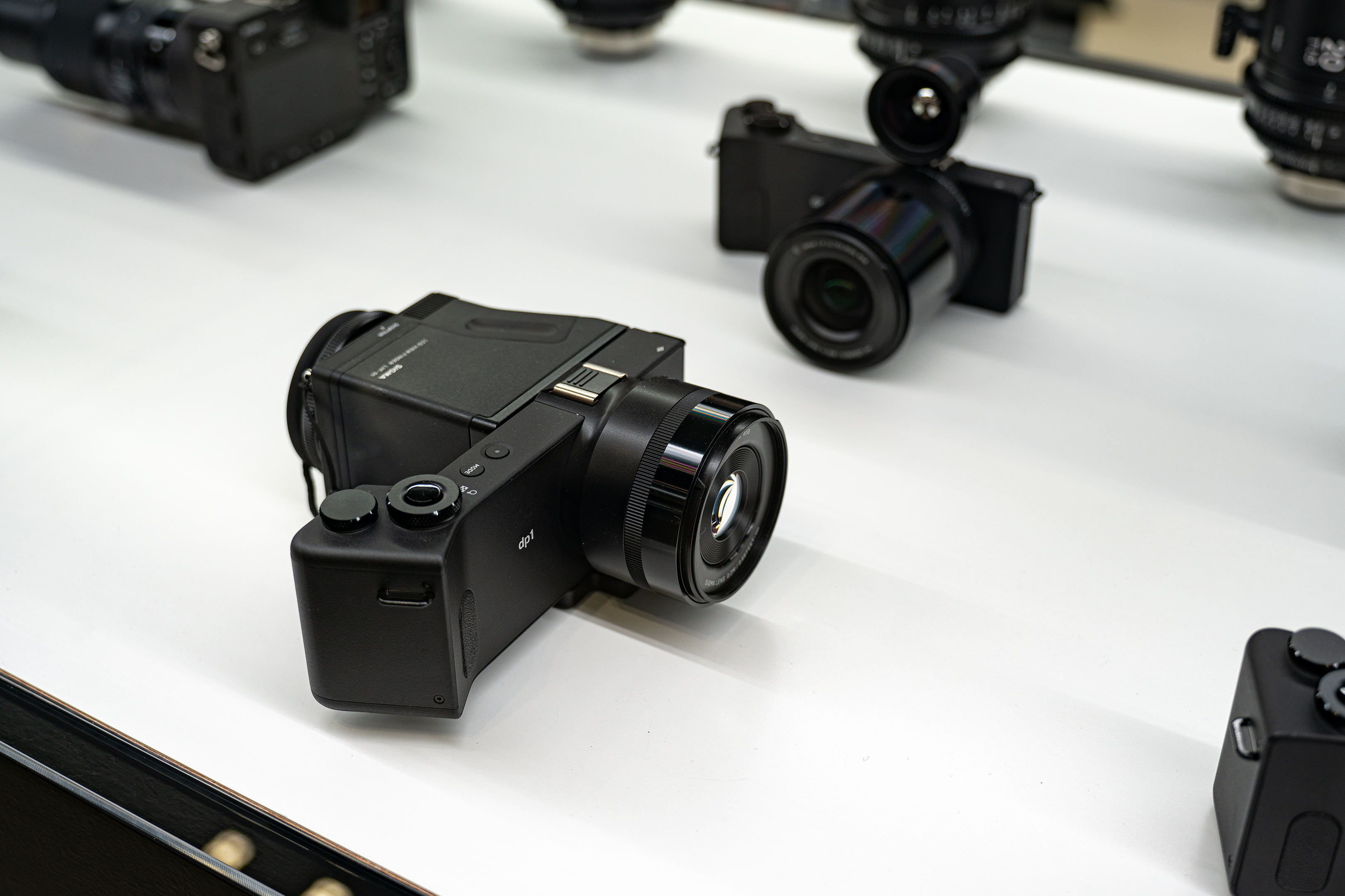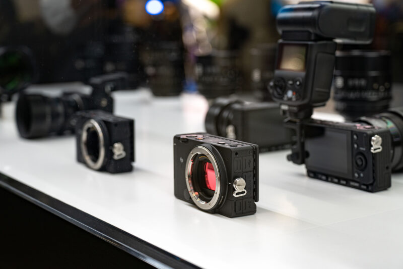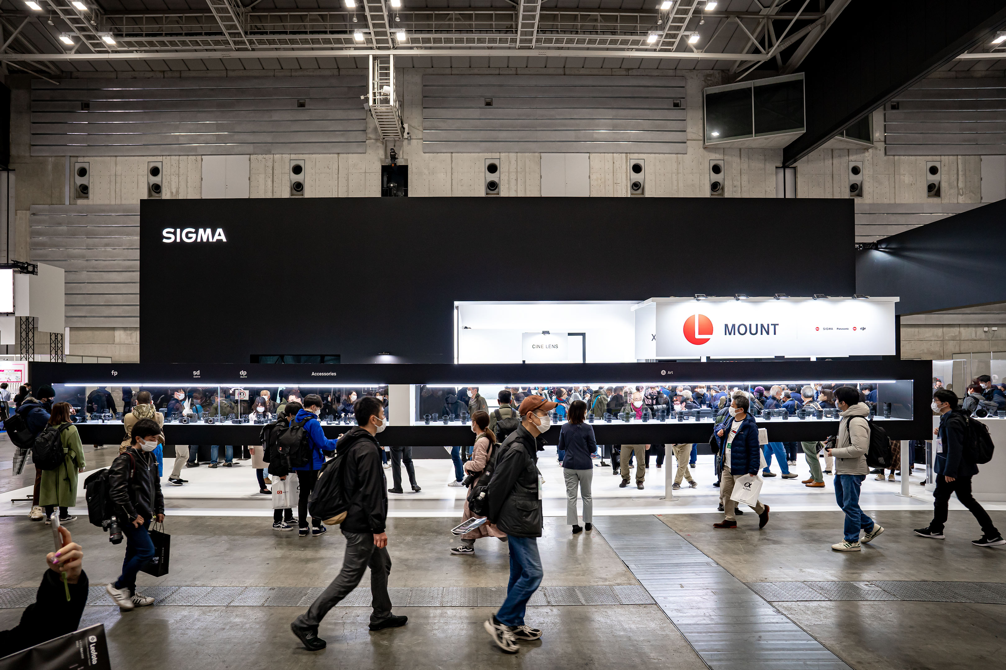 SIGMAブースのデザインセンスの良さは毎回感心させられます。今年は一面のブラックパネルにさり気無いSIGMAロゴ、そして手前には横一列に長く続く両面ショーウィンドウ。
