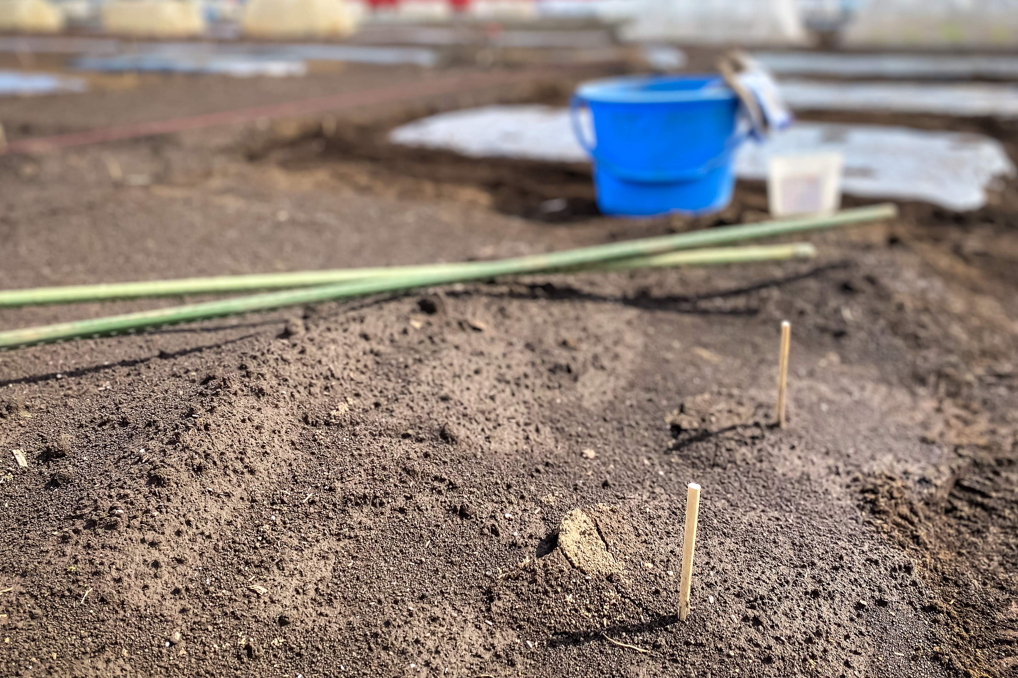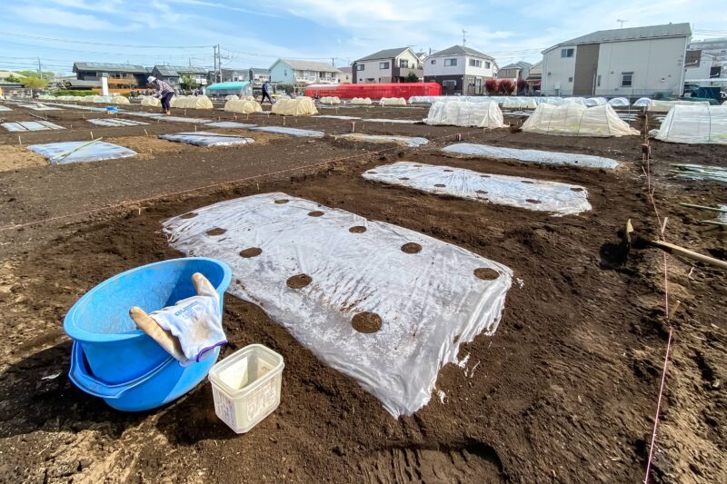 実施内容はトウモロコシとエダマメ、それぞれの種を蒔く準備。堆肥と肥料を規定分量入れて耕し、9230マルチと呼ばれるビニールを掛けます。先日作業したレタス、ルッコラ、水菜、大根や、落花生、里芋の時は黒いマルチを敷きましたが、今回は透明の9230。