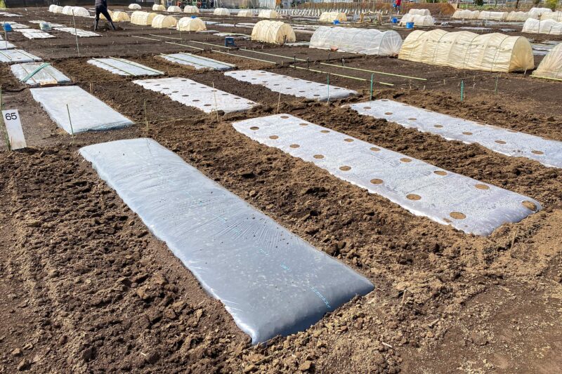 こちらはベテランさんの仕上がり。畑の面積が広いのでマルチの長さもその分長くなっているという違いはありますが、それよりもこの美しい見栄えには惚れ惚れします。マルチって長くなればなるほどシワが寄ったりすると思うのですが、どうやったらこんなに美しく仕上がるのでしょうね。