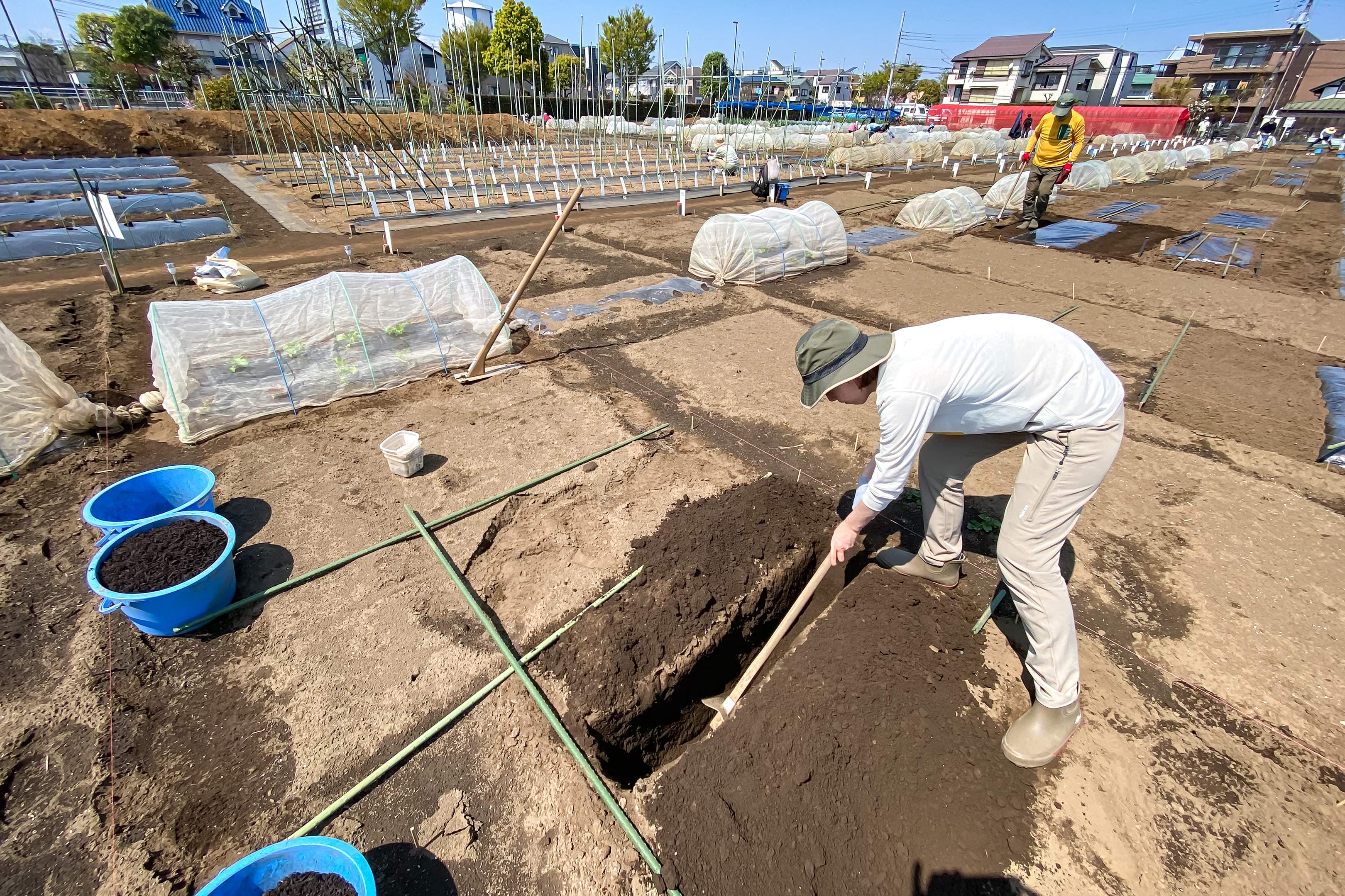 これまで準備してきた作物と違い、ナスやシシトウは地中深くの栄養を必要とするらしく、そのぶん深層まで肥料を行き渡らせるのが上手に育てるコツなんだとか。鍬を使って40cmほどの深さに肥料を埋めます。話によればプロの農家さんは地中1メートルも掘る事があるらしいです。