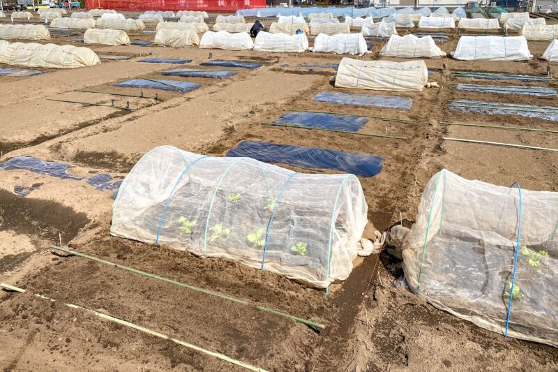 この時期の定植後は防風、保温、防虫などの目的でトンネル状にネットを掛けますが、我々が使用すトンネル素材にも3種類あって目的に応じて使い分けます。保温効果の高いユーラック、遮光や防虫、防寒・防霜の寒冷紗、害虫防除のサンサンネット。成長促進にはユーラックが効果的らしいですが、近年は温暖化の影響で日本も暖かくなりましたし特に今年は気温が高めという事で、我々はユーラックではなくサンサンネットをチョイス。