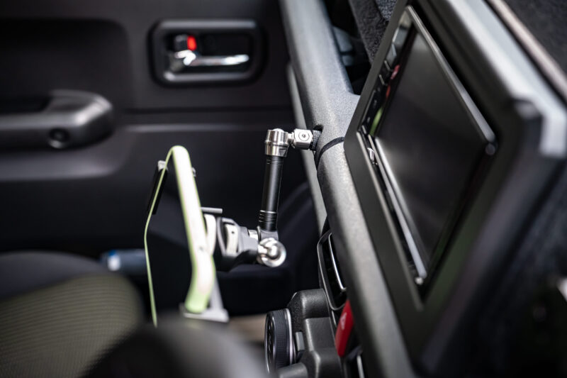 一般的な多くの車はインパネ周りの目につくところにネジが見えないようプラスチックカバーで覆われていて、各パーツは固定用の爪でパチンパチンとはめ込まれているだけですから、こうしたパーツを固定するには両面テープで貼り付けるか吸盤で固定するような工夫が必要ですが、ジムニーの場合はご覧の通り純正オプションを取り付けるかのように自然な仕上がりで装着できます。