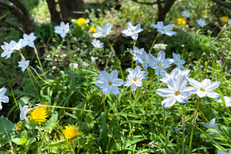 頭上に桜の花びらが舞う頃になると足元には名も知らぬ小さな白い花があちこちに咲き始めます。