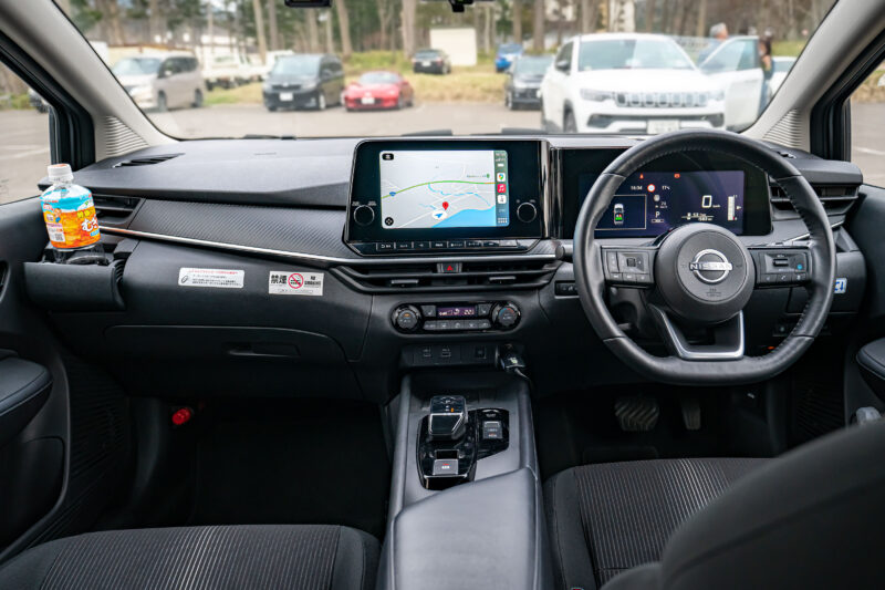 まずロードノイズが静か。借りた車はまだスタッドレスタイヤを履いていたにもかかわらず、タイヤが転がるロードノイズが恐らくプリウスより静かですね。最新のプリウスにはまだ乗った事が無いので一世代前のモデルとの比較ですが、多くのハイブリッドカーはエンジン音は非常に静かですがロードノイズが気になる車が多いところこのNOTEはそれが静かなのです。ラダーフレームを採用しボディーとシャーシが分離しているジムニーと同じくらい静かに感じました。それだけでドライブの疲れ方もだいぶ少ない気がします。