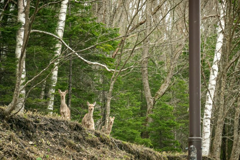 こちらの鹿は、合計10頭くらいの家族で移動していました。目の前の道路を堂々と横断していくため思わずブレーキを踏みました。