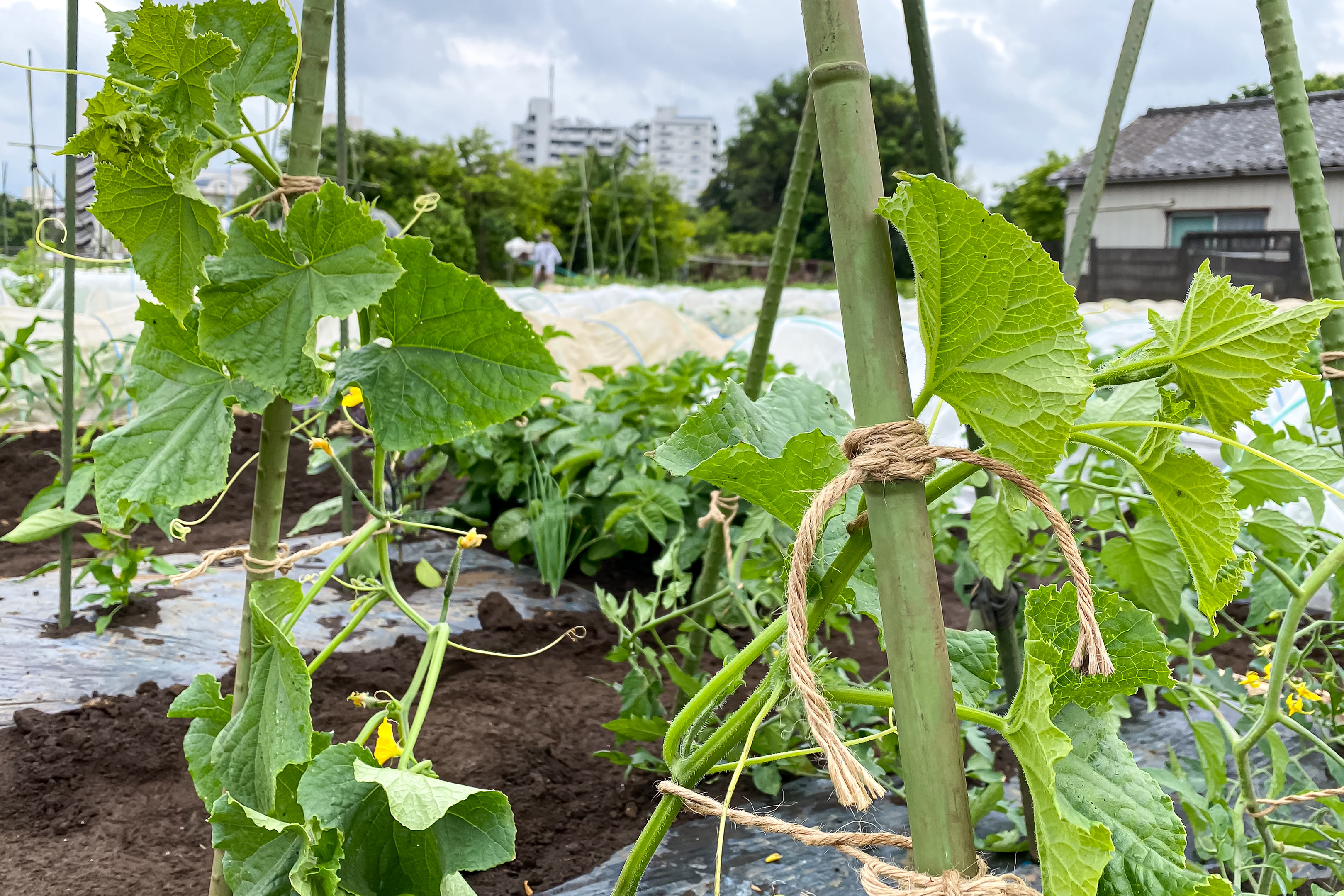 支柱に対して作物を麻紐を使って縛る作業は大変気を使います。特にこうした雨天や雨上がりには、トマトやきゅうりが元気になりますから無理に引っ張って縛ろうとすると簡単に茎が折れてしまうんだとか。そのため最適な作業のタイミングとしては日照りが続いて作物が少しぐったりしているくらいが安全というわけ。この日は慎重に作業を進めました。