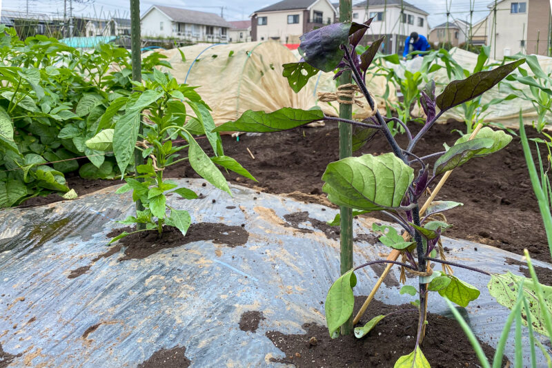 ナスとししとうの支柱立てに関しては作物の隣に一本棒を真っ直ぐ立てるだけなので非常にシンプルに終わりました。こちらもゆとりをもって引っ張りすぎないように作物を麻紐で固定します。