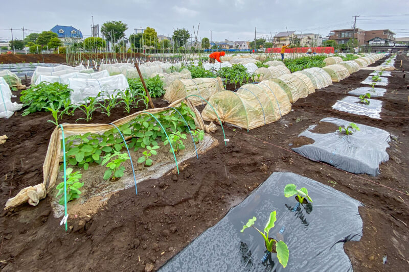 トウモロコシはいよいよスイッチが入り一気に成長を始め既にトンネルに背が届いてしまいましたから、このタイミングで黒マルチとトンネルを撤去することになりました。また、全面散布にて追肥をし、これから人の背丈を越えるくらいの大きさまで成長させていきます。