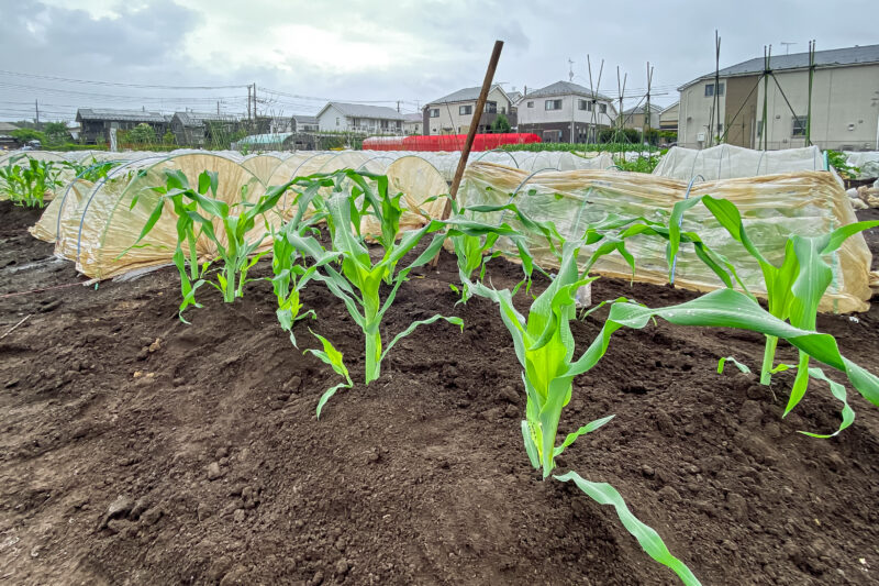 但し、トウモロコシは丈夫そうに見えて風に弱いらしくすぐに倒れてしまったりするそうなので、特にトンネルを外した今は強風で倒れないよう根本に盛り土をしています。