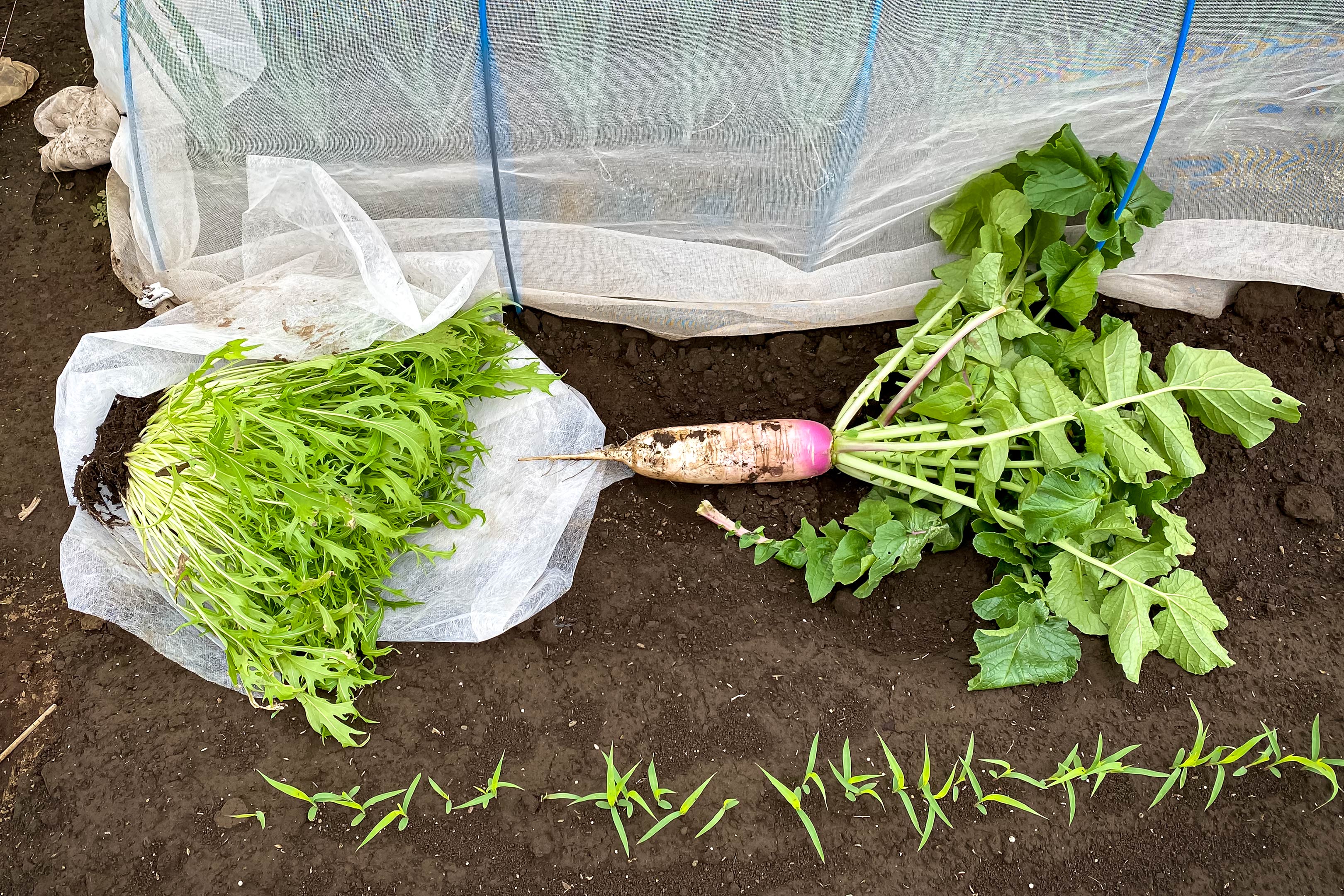 大根もトンネルを押し上げるくらいの勢いで急成長しており葉っぱの密度が大変な事になっています。現在3穴で合計5本の大根が植っています。今回は先週に引き続きそのうちの1本を間引きがてら引き抜いて収穫としました。最終的には3穴にそれぞれ1本ずつ合計3本を本命として残しますから、来週あたりまた1本を引き抜く計算ですね。