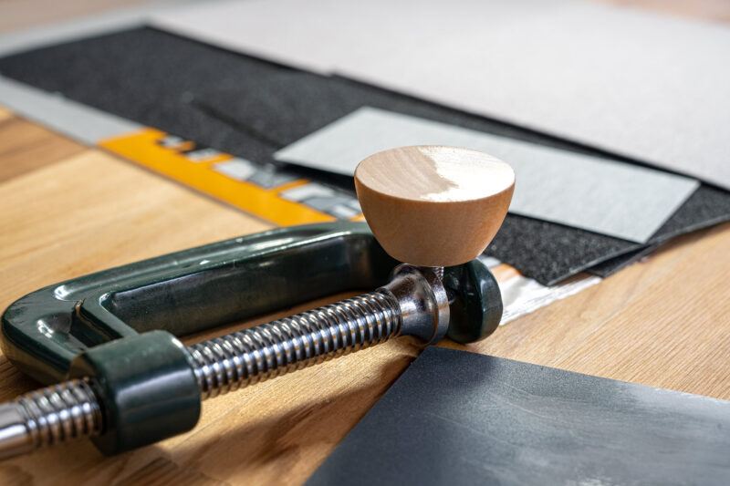 1度塗ったら乾燥させ、600番程度のサンドペーパーで研ぎ、2度目、3度目を塗ったら再度サンドペーパーで研ぎ、そんな事を繰り返しながら合計7回ほどの重ね塗りをすると木材の巣穴も完全に塞がります。最終仕上げの直前は2,000番のサンドペーパーで表面のケバや凹凸を平すように磨き、仕上げ塗りはペーパー目を消す程度の薄塗りを行いました。