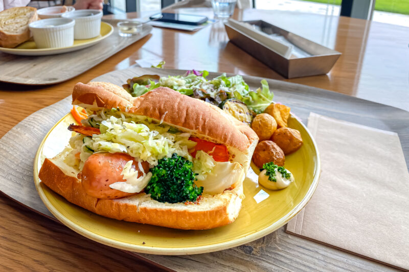 こちらにはファームという名前からは想像もつかないようなお洒落な建物が。道の駅をもう少し現代風にアレンジしたようなマルシェでは5色展開の人参が販売されていたり、数種類のズッキーニが並んでいたりして目移りしてしまうくらいですが、ここは購入するだけでなく採れたて野菜を使ったランチが頂けるレストランとしても機能しています。
