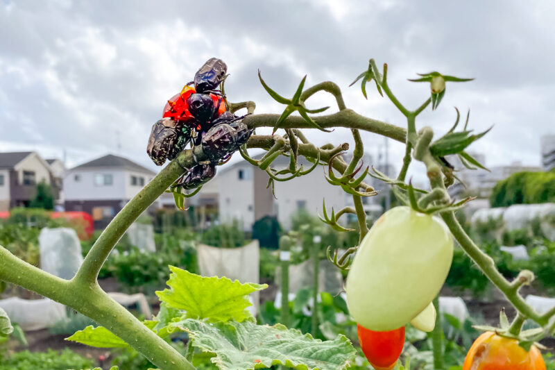 撤去直前のトマトはこんな感じ。かなりグロテスクな写真ですが、一つのトマトにカナブンが8匹群がっていました。カナブンも1匹2cmくらいある大きなものなのでかなりの迫力。他のトマトも完熟したもののいくつかは同様に食い散らかされました。
