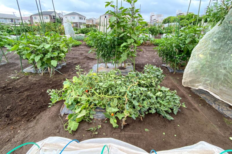 上の写真は支柱を撤去し、それぞれの木を根本からバッサリ切り落とした図。この後、すべての残さをゴミ捨て場に移動しマルチを剥がし土を耕して秋冬野菜の準備完了。ちなみに奥に見えているナスとシシトウの木はまだ秋まで収穫が続きます。