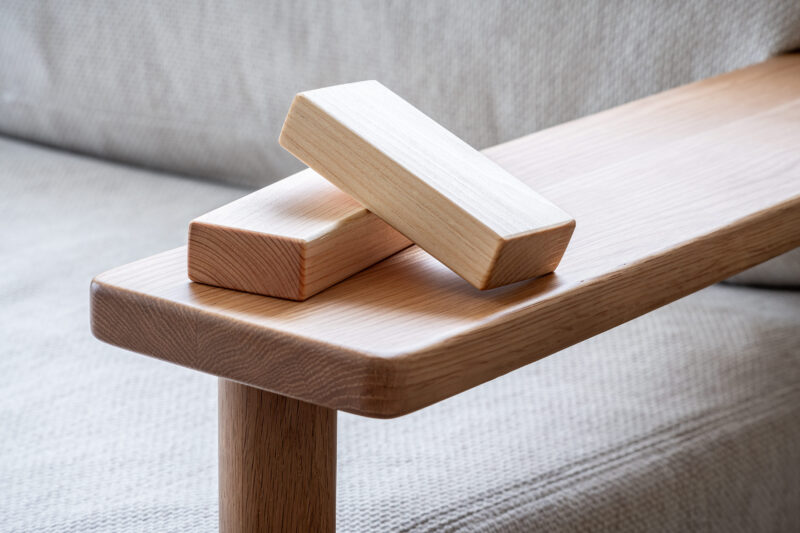 実際はソファーの足にも傷がつかないよう、家具の足に貼り付けるような傷防止のフェルトを表面に貼り付けて完成です。現時点ではまだ仕上げに塗ったオイルが乾き切っていないので、数日乾燥させてからフェルトを貼り付けます。