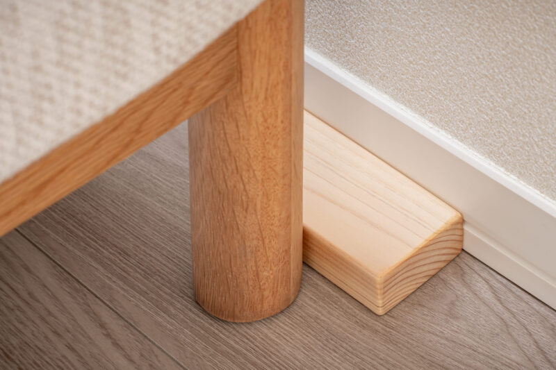 なんてことはない、単に角材を切り出し面取りをし木彫オイルで仕上げを行っただけですが、これをソファーの後ろ足と壁の間に挟んでおくだけでストッパーとなり、これまでのように床に両面テープで固定するよりもはるかに安定的にソファーの移動を抑制できるはず。