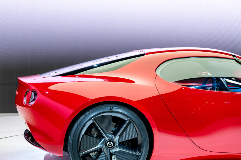 リアガラス形状は嘗てのRX7を彷彿とさせます。最近はこんなふうに左右に巻き込むような曲面ガラスが採用される車って少ないと思うのですが、この辺りがマツダらしさでしょうかね。