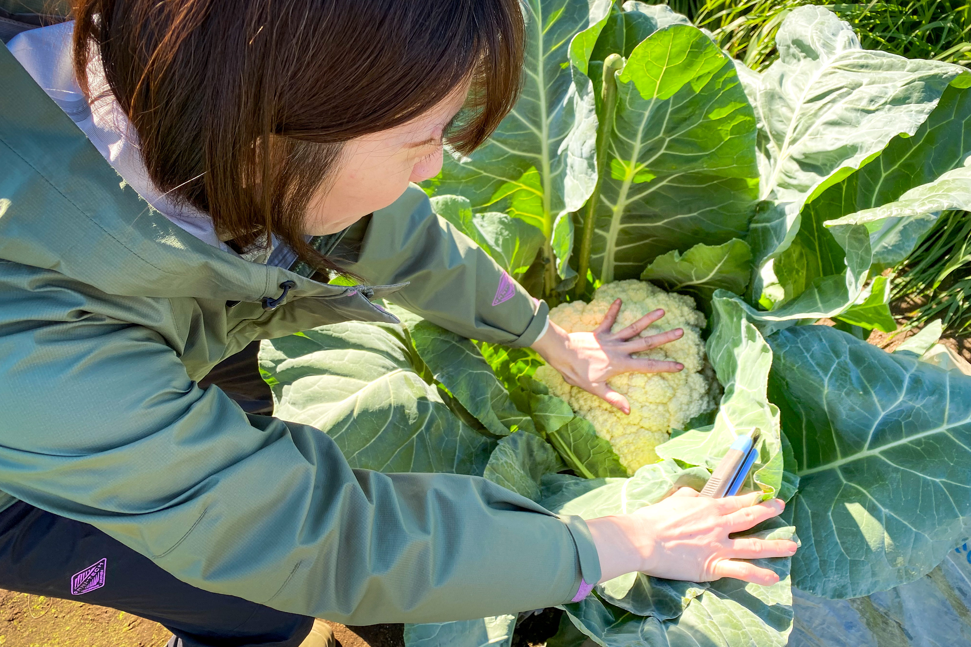 こちら、当ブログでは初公開のカリフローレ。カリフラワーの親戚で最近人気の野菜らしいです。驚くのはそのサイズで、どこか遠い国のジャングルに咲く世界一大きな花みたいに、人間を飲み込みそうな迫力。人の手のひらと比べてもわかるように現段階でヘルメットくらいの大きさ。当然一気に食べられませんから周りから少しずつ刈り取っていきます。それでもまだこの段階では収穫にはやや早いくらいでこの先更に丈を伸ばしてくるようです。恐ろしや...。