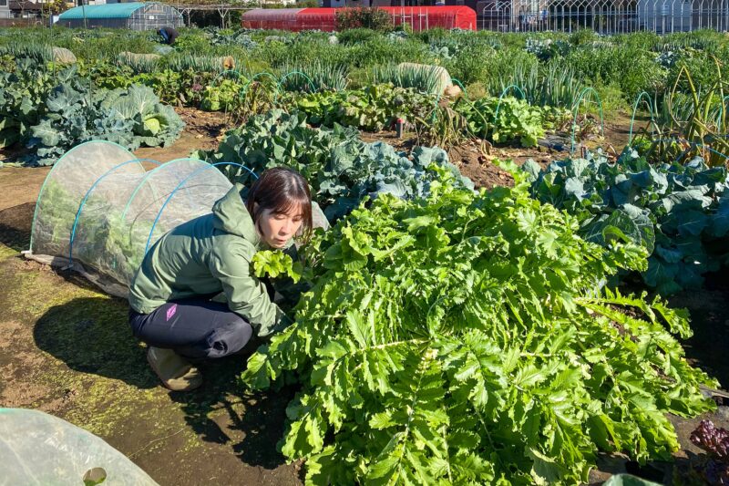 こちらはこちらで大変な茂みになっていますが、収穫しているのは大根です。これまで青首大根4本はすでに収穫を終えており、今日は聖護院大根。カブのようにまんまるな大根で、おでんや煮物にすると歯がなくても食べられるくらい柔らかくなると有名な品種。