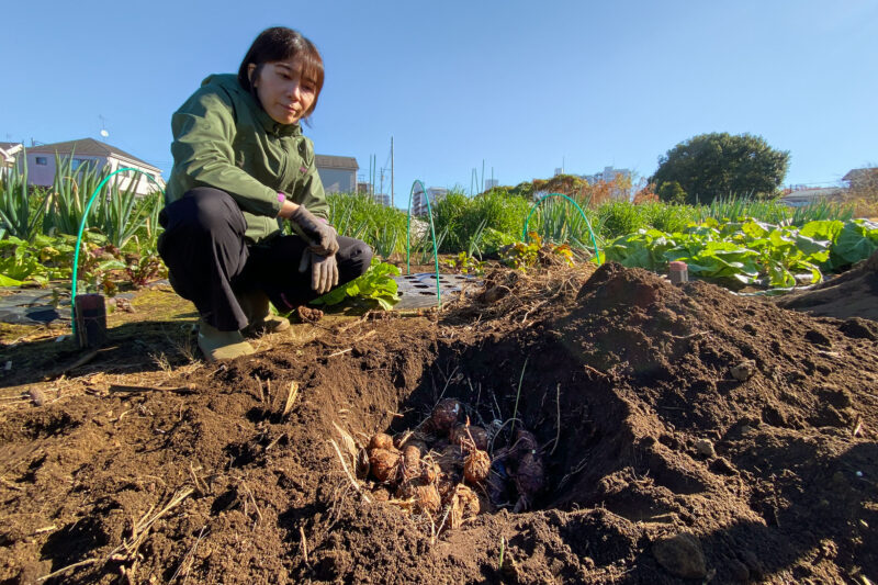 春から長らく育ててきた里芋と筍芋は直近で食べる分だけ収穫し、残った分は上の写真のように畑に穴を掘って埋めて保存します。土の中の方が温度が安定するため長期保管に向いているというわけです。お正月の煮物作りで必要になったらまた掘り返す...リスみたいな動物から学ぶ工夫ですね。