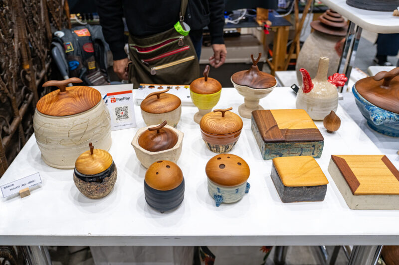 陶芸家アーティストの方が下半分の器を製作し、木工アーティストの方が器に合わせて蓋を作る、つまるところ二人のアーティストの合作により生まれた作品の数々。
