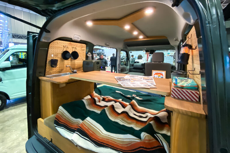 シンクが見当たらないのはあえて非搭載としているから。軽キャン用のシンクって小さすぎて実用性に疑問が残るところ、それでも搭載するとなれば給水排水タンクを2つ積まなければなりませんからスペース効率が悪いんですよね。それならいっそシンクレスにしてしまってその他の装備を充実させるのが吉、その答えがこの車なんでしょう。