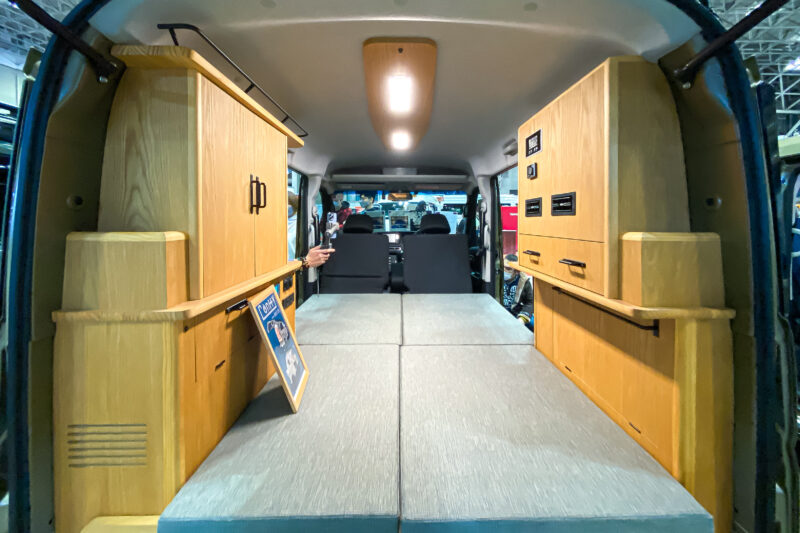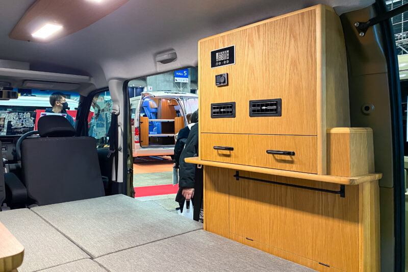 助手席側のボードが少々大袈裟に出っ張っているのはバッテリーが搭載されているからでしょうが、これによりベッドスペースは2名で寝転がるには少々窮屈そう。おそらく頭をフロント側、足をリア側に向けて寝る事でそれらの問題はギリギリ解決するのでしょう。