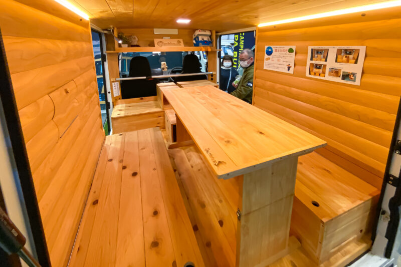 エクステリアからは想像もつかないほど内装は和風モダンで、視界に入る全てがヒノキ無垢材で作られています。ラグジュアリー重視の高級キャンピングカーの雰囲気とはまた違って、こういう安らぎ空間もまた良いものです。