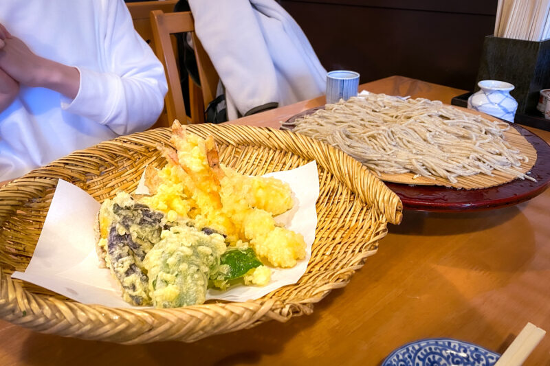 注文したのは ”天付き蕎麦五合 二人前”。そして現れたのはざるに綺麗に盛られた天ぷらと、丸い板蕎麦みたいな形状の盛り蕎麦。これは注文する時点で気づいたことですが、このお店ではどうやら温かい蕎麦というメニューは無いようで、基本的には全て冷たい盛り蕎麦。唯一温かいつけ汁というのは ”変わり汁オプション” として選べるみたい。