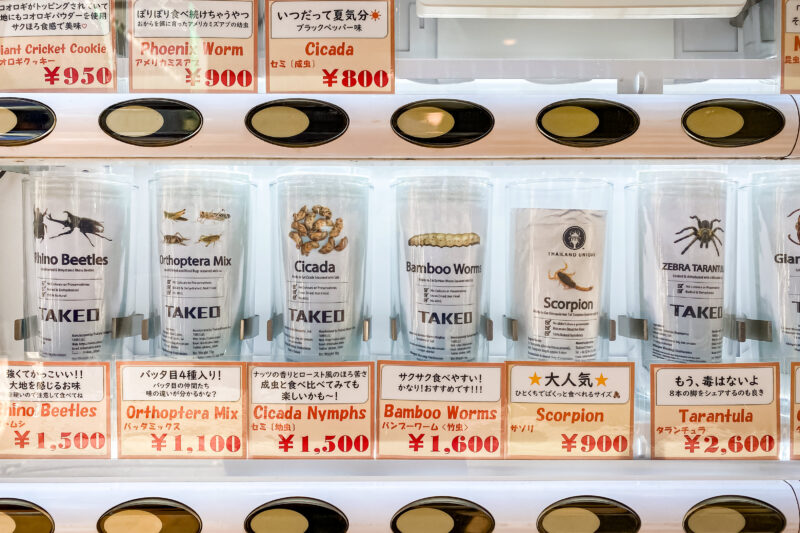げ、なんですかこのお値段。最高額は1本2,600円。その内容は各種昆虫。正確には昆虫食自販機と呼ぶそうですが、ブラックペッパー味とか書かれているところを見ると酒のツマミということでしょうかね。バッタやサソリ、タランチュラの他、カブトムシの缶も見受けられますが、小さな虫ならともかくカブトムシって結構大きいので口に入れるのはちょっと抵抗ありますね。