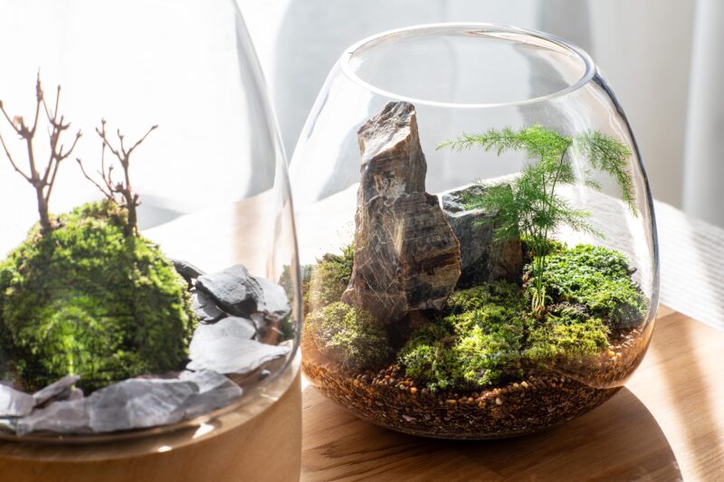 こちらは同時に作ったアスパラと飾り石をレイアウトした一般的なテラリウム。