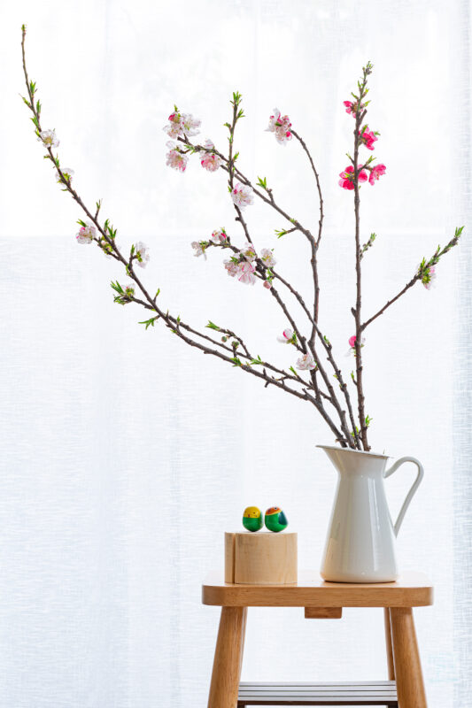 これが梅の花だとこうはいきませんよね。そもそも1本の木で2色の花が咲くことはまずありませんし、仮に異なる2本の木を組み合わせるにしても白とピンクだったりするのでお互いの色馴染みがちょっと悪い気がして。桃はそこんとこ絶妙です。